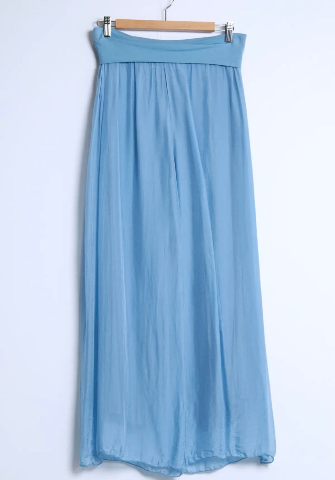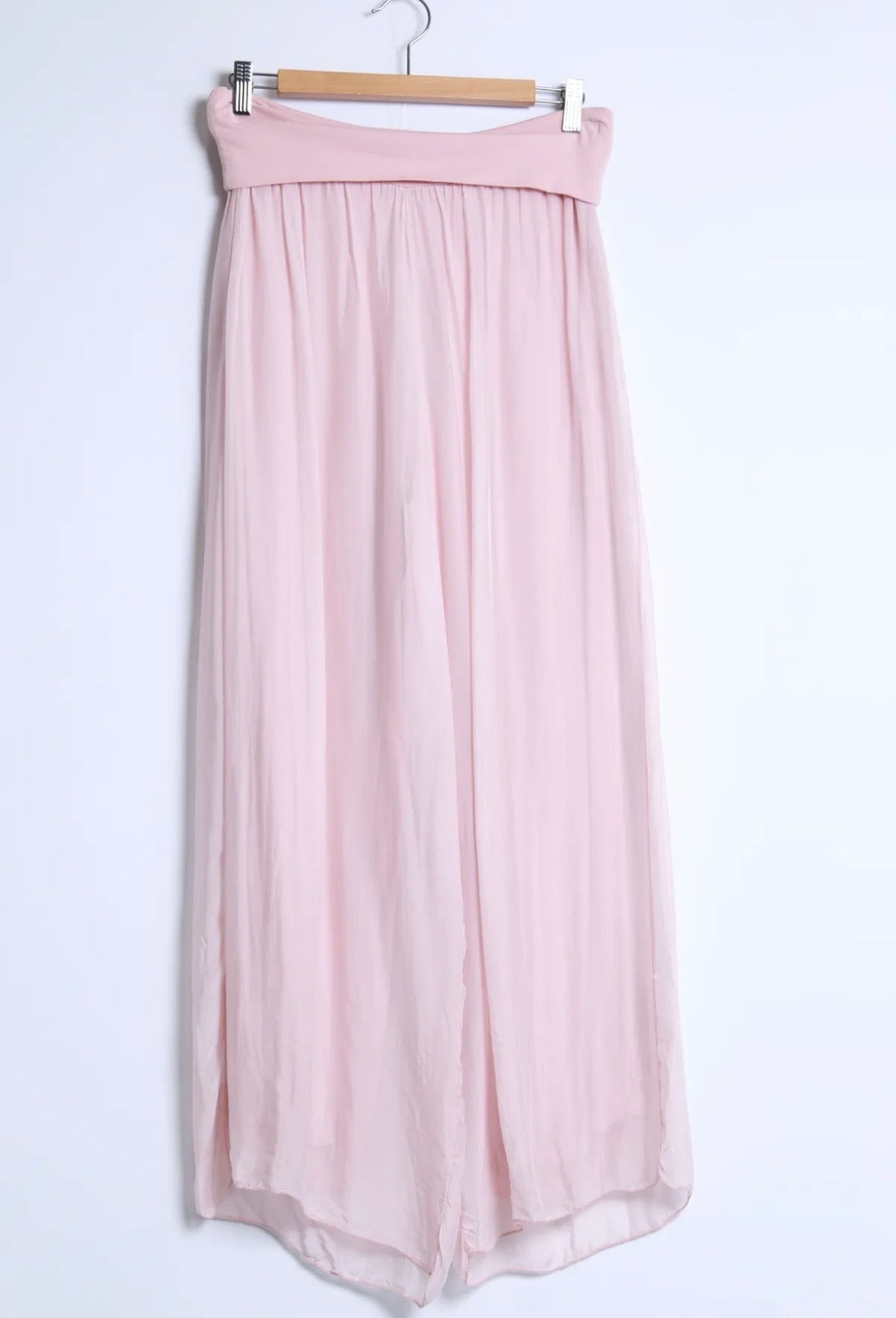 Ihanat kevyet hieman läpikuultavat silkkiviskoosi housut, missä viskoosi vuori. Näissä viskoosivuori ja silkki ovat erikseen. Silkki laskeutuu kauniisti ja kevyesti viskoosivuoren päälle.