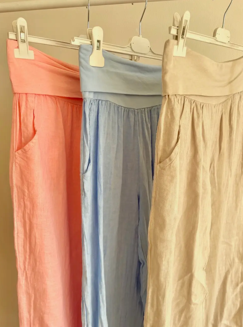 Ihanat Seili pellavahousut kesän sävyissä. Seili pellavahousuissa on leveä stretchvyötärö ja taskut. Pellavahousu on ihana vaate niin vilpoisilla kuin kuumillakin keleillä. Yhdistät Seili pellavahousun helposti istuvaan tai rentoon yläosaan.