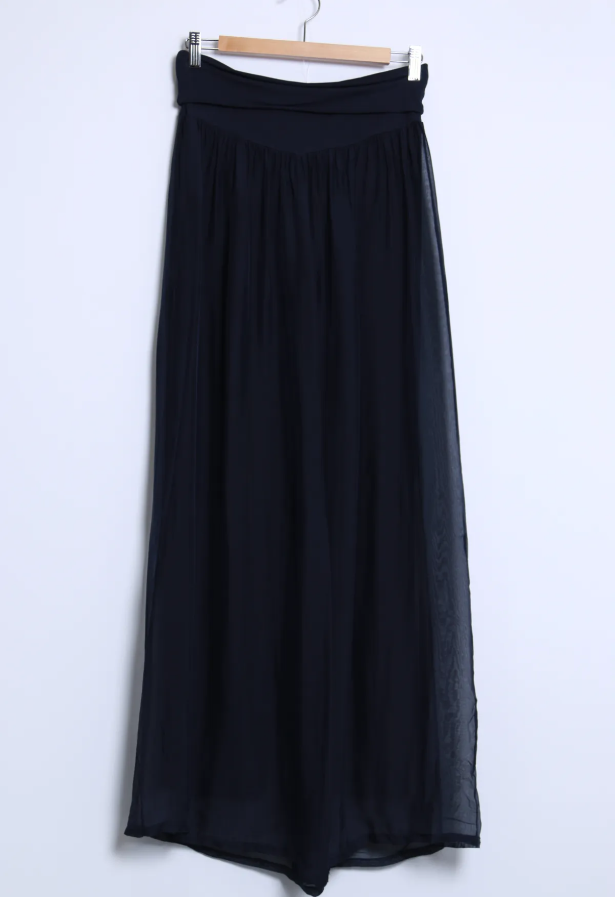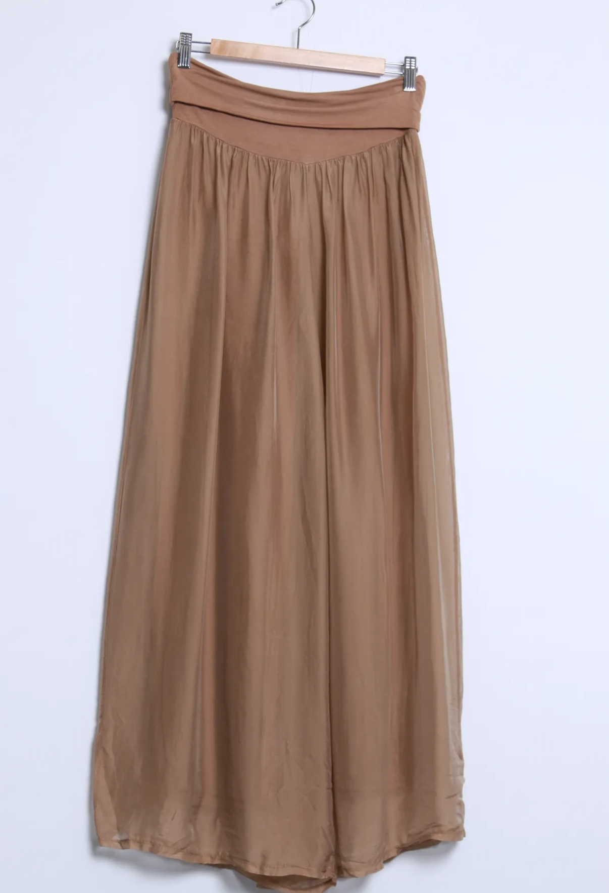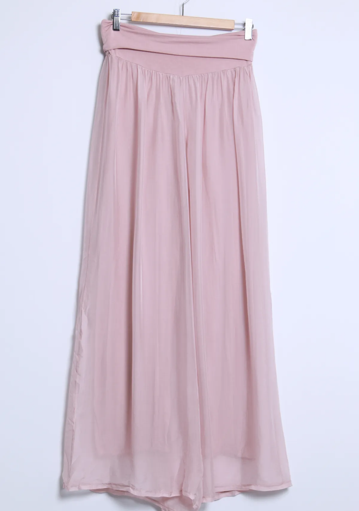 Ihanat kevyet hieman läpikuultavat silkkiviskoosi housut, missä viskoosi vuori. Näissä viskoosivuori ja silkki ovat erikseen. Silkki laskeutuu kauniisti ja kevyesti viskoosivuoren päälle.