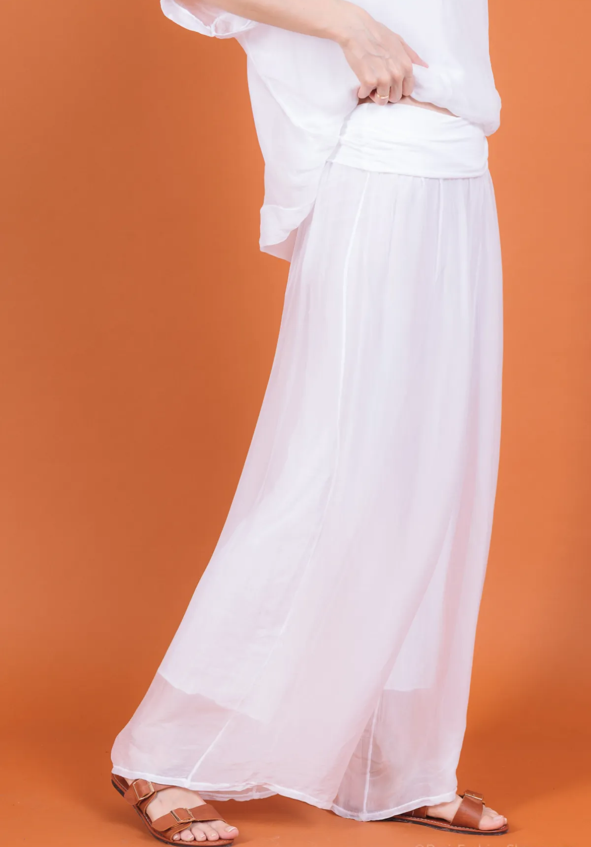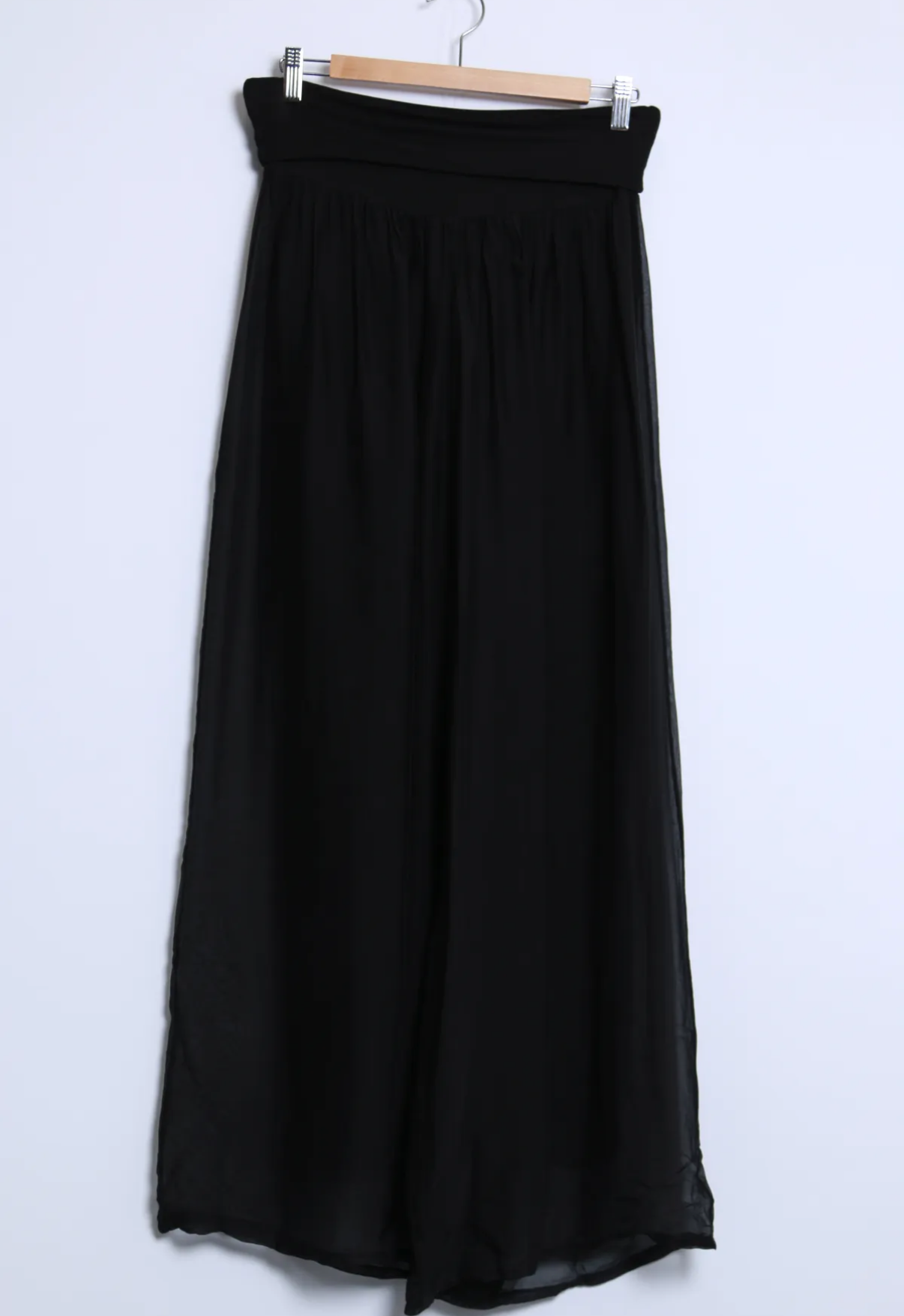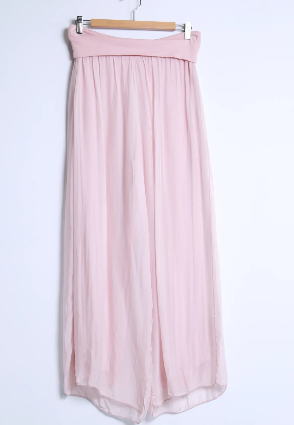 Ihanat kevyet hieman läpikuultavat silkkiviskoosi housut, missä viskoosi vuori. Näissä viskoosivuori ja silkki ovat erikseen. Silkki laskeutuu kauniisti ja kevyesti viskoosivuoren päälle.